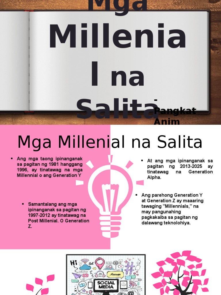 13Triggered Ito ay ginagamit ng mga millennial para ipahayag ang kanilang masamang damdamin sa tuwing mayroon silang di kaaya-aya na nakikita o naririnig. 1Millenia l na Salita-Pangkat Infographic Style Mga Millenial na Salita Ang mga taong ipinanganak At ang mga ipinanganak sa sa pagitan ng 1981 hanggang pagitan ng 2013-2025 ay 1996 ay tinatawag na mga tinatawag na Generation Millennial o ang Generation Y Alpha. 28Ang mga millennial na salita ngayon ay nabubuo sa pamamagitan ng mga bagay na nauuso sa modernong panahon.